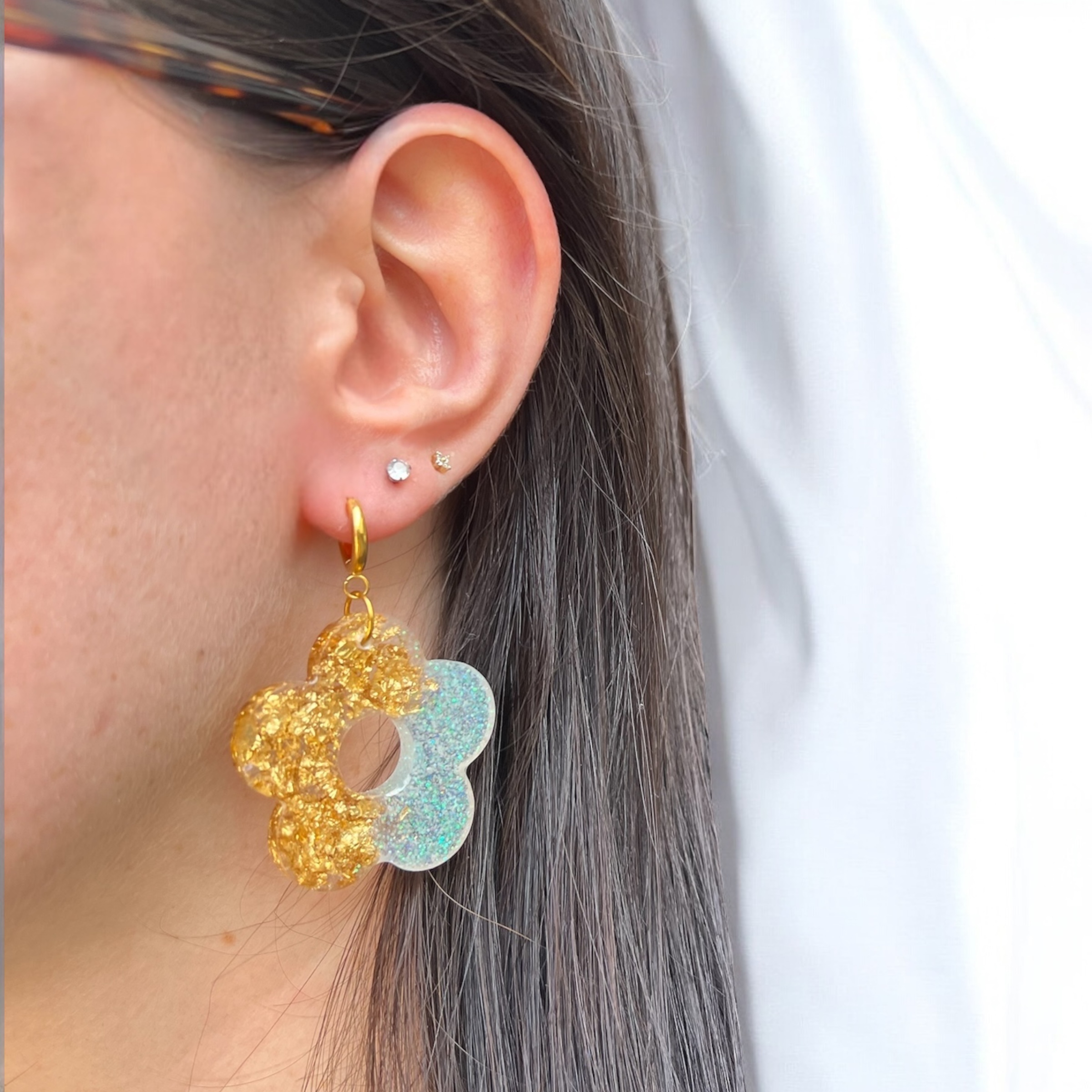 Pétillante — Les « Cécile » illuminent votre style. Leur pendentif en forme de fleur, réalisé en résine bicolore blanc et dorée. Montées sur un anneau en acier inoxydable dorée, ces boucles mêlent originalité et élégance.