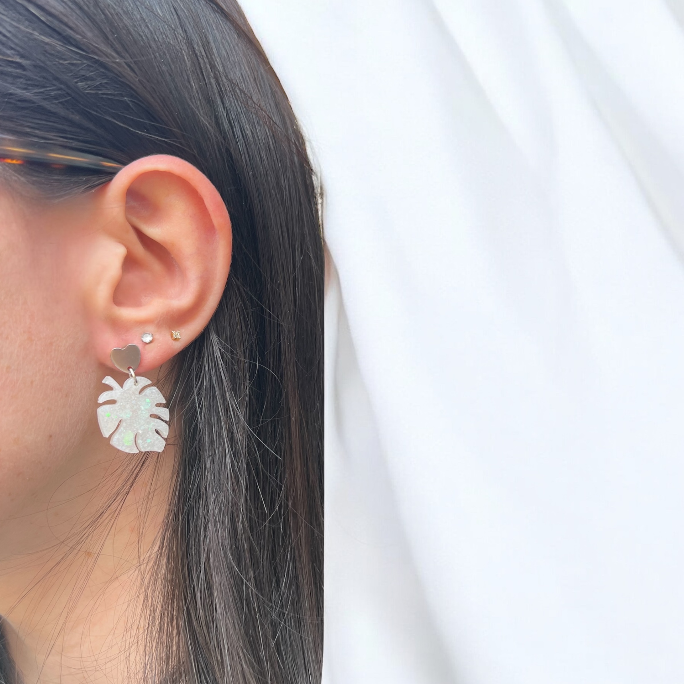 Délicate, raffiné — Les « Francine » sont élégante, sa résine blanche et ces paillettes sont suspendu à une accroche en forme de cœur en acier inoxydable argenté. Ce modèle en feuille est étincelant, il se distingue par ses reflets bleuté au soleil.