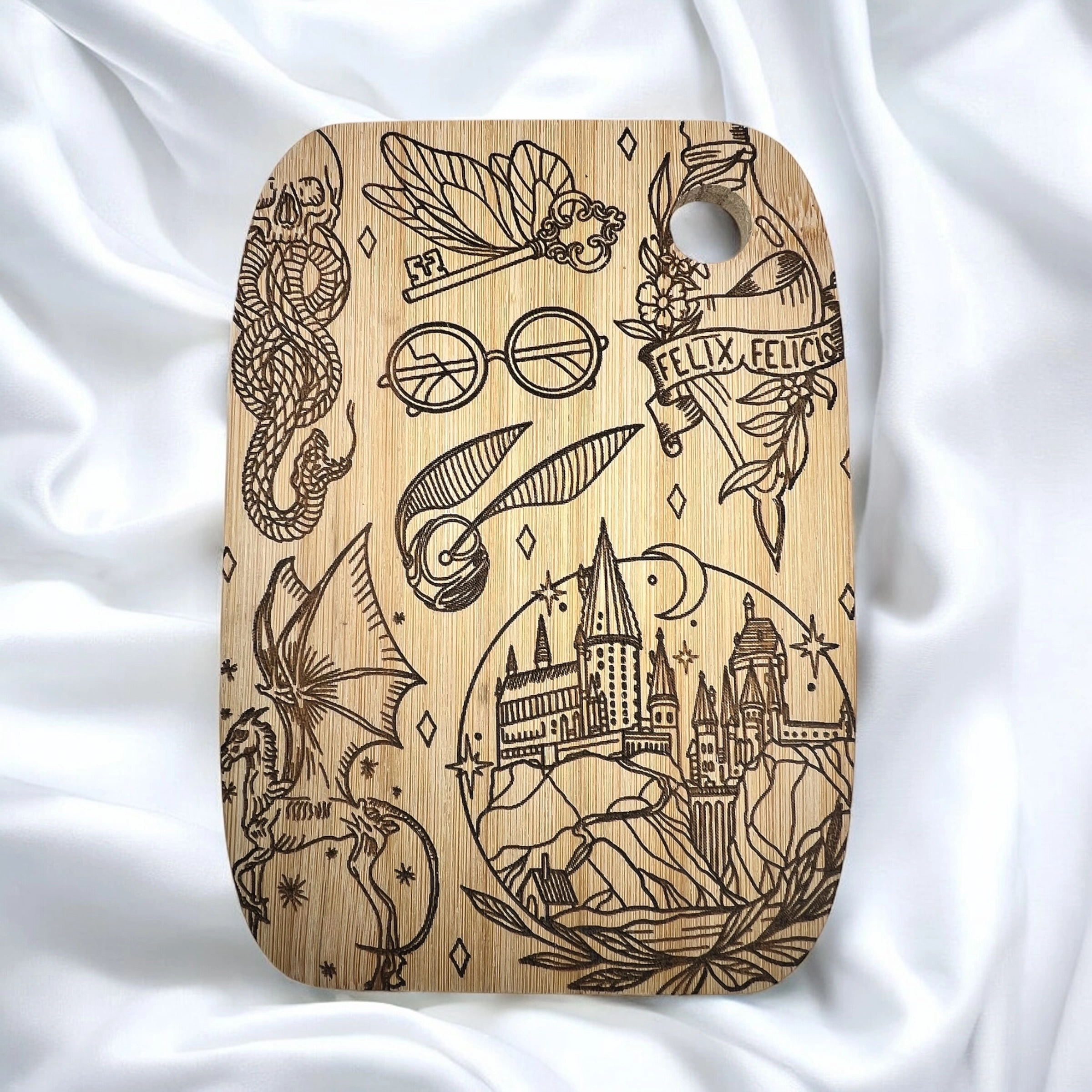 Ajoutez une touche féerique à votre cuisine avec cette magnifique planche en bambou gravée au laser. Inspirée de l’univers magique, elle présente des motifs iconiques tels qu'un château enchanté, des lunettes rondes célèbres, un vif d’or, une bouteille de potion "Felix Felicis", un dragon, et d'autres symboles mythiques. Chaque détail est soigneusement gravé, créant une pièce à la fois pratique et décorative.